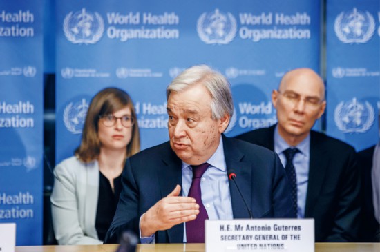 2020年2月24日,聯(lián)合國秘書長古特雷斯(前)在瑞士日內瓦世界衛(wèi)生組織總部發(fā)表講話。古特雷斯表示,中國實施嚴格的防控措施,以犧牲正常生活的方式為全人類作出了貢獻。古特雷斯當日造訪日內瓦世衛(wèi)組織總部,并與世衛(wèi)組織各部門負責人舉行座談。 新華社發(fā)