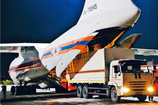 2020年2月8日,在俄羅斯莫斯科附近的茹科夫斯基機場,工作人員將俄羅斯政府向中方提供的醫(yī)療援助物資裝上運輸機。 新華社/衛(wèi)星社