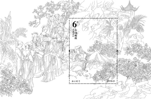 蕭玉田沒少花心思,他認真推敲構圖,反復調整后,將小型張中心設計為郵票畫面,打上齒孔后是可以獨立出來又相對完整的只有一個人物的“湘云醉眠”畫面,人物、青石凳、芍藥、假山等構成元素應有盡有,假山下部的虛化處理給面值、票名等文字留出了位置。齒孔內的主體人物湘云及背景與齒孔外面的寶玉一眾人、芍藥、樹木、假山等有機組合成“S”形構圖,又是一幅大景觀、多人物整體協調的“湘云眠芍”作品,齒孔內外既相互獨立又整體統一,可分可合。