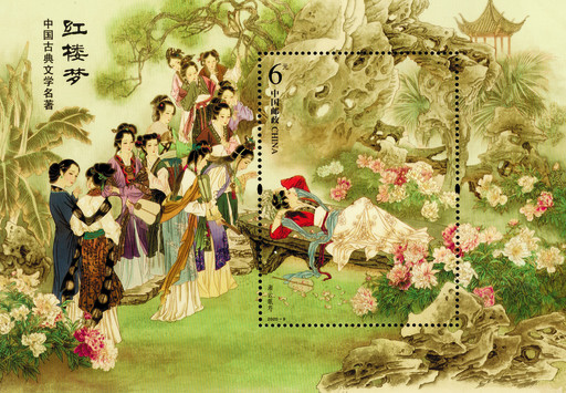 5月17日發行的《中國古典文學名著——〈紅樓夢〉(四)》特種郵票,4枚郵票內容分別為“鴛鴦抗婚”“寶琴立雪”“三姐還劍”“惑讒抄園”,小型張為“湘云眠芍”。由設計了該系列郵票第二組、第三組的著名工筆畫家蕭玉田繼續擔綱設計。