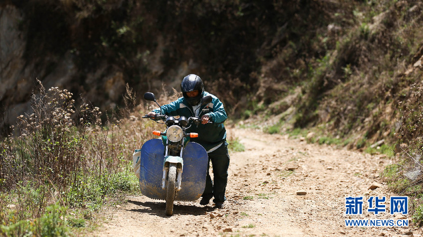 遇到陡坡路段,桑南才推著摩托車前行(5月10日攝)。新華網 趙普凡 攝