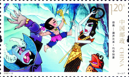 《葫蘆兄弟》故事情節(jié)復(fù)雜,場面變化大,人物也較多。人物就有七個(gè)葫蘆兄弟、老爺爺、蛇精、蝎子精和穿山甲等,而七個(gè)葫蘆兄弟性格特點(diǎn)和超能力也不一樣,都需要區(qū)別表現(xiàn)出來。從故事情節(jié)來說,不少是驚心動(dòng)魄、險(xiǎn)象環(huán)生的激烈較量場面。比如,第3枚郵票“絕路逢生”反映三娃大戰(zhàn)群妖,打得妖怪落花流水、抱頭鼠竄,畫面表現(xiàn)的是三娃用神力斬?cái)嘈泳膶毜?,蝎子精大驚失色的情形,此段畫面是故事的一個(gè)小高潮;再如第5枚郵票“巧奪如意”主要講述擁有隱身神力的六娃機(jī)智勇敢地盜取了蛇妖的寶貝“如意”,救出了幾位兄長,此段情節(jié)尤為精彩。