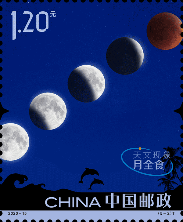 月全食郵票中,夜光墨的使用來表現(xiàn)滿月到月全食過程中不同亮度的月光效果。
