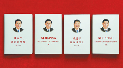 中央宣傳部(國務(wù)院新聞辦公室)會(huì)同中央黨史和文獻(xiàn)研究院、中國外文局編輯的《習(xí)近平談治國理政》第三卷,近日由外文出版社以中英文版出版,面向海內(nèi)外發(fā)行。這是《習(xí)近平談治國理政》第三卷中英文版的精裝版和平裝版(六月二十九日攝)。 新華社記者 李 賀攝