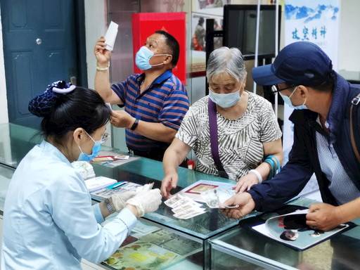 7月11日,江蘇省徐州市淮東集郵營業(yè)廳內(nèi),郵迷正在購買《故宮博物院(二)》特種郵票。 □謝安吉 攝影報道