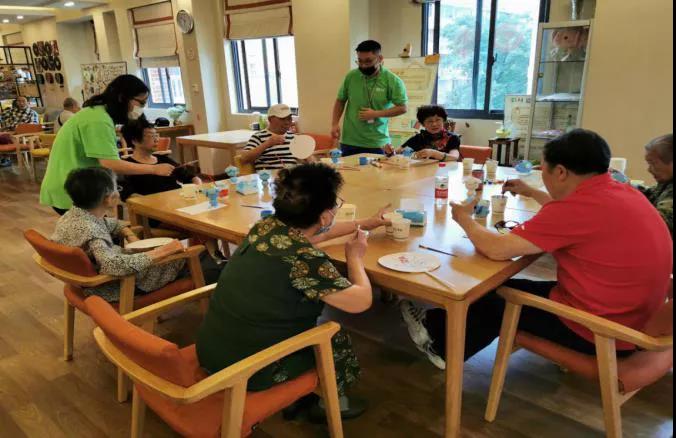 在三樓長(zhǎng)樂(lè)日間照料中心,專(zhuān)職社工正在教老人們繪畫(huà)填色。侯亞景 攝