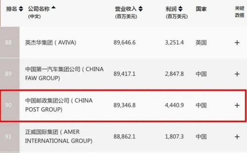 8月10日,《財富》雜志發布2020年世界500強排行榜。中國郵政位列第90名,相比去年上升11位,年營業收入、利潤均排名世界郵政第二位。