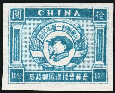 2.抗戰(zhàn)勝利后,各根據(jù)地陸續(xù)發(fā)行了抗戰(zhàn)勝利紀(jì)念郵票。晉察冀邊區(qū)于1945年到1946年發(fā)行的該題材郵票主圖為“八路健兒疆場(chǎng)殺敵圖”,并且以此圖案發(fā)行過(guò)兩次郵票,根據(jù)票幅大小不同分別稱作“抗戰(zhàn)勝利紀(jì)念大型郵票”(俗稱“大抗戰(zhàn)”)和“抗戰(zhàn)勝利紀(jì)念小型郵票”(俗稱“小抗戰(zhàn)”)。晉冀魯豫邊區(qū)分別于1947年3月和7月發(fā)行了“抗戰(zhàn)勝利一周年紀(jì)念郵票”和“抗戰(zhàn)勝利二周年紀(jì)念郵票”,兩套郵票主圖相同,顏色不同,均為毛澤東主席和朱德總司令的側(cè)面像,這是抗戰(zhàn)期間指揮邊區(qū)軍民抗擊日寇的兩位領(lǐng)袖。東北區(qū)1947年發(fā)行了三種紀(jì)念抗戰(zhàn)的郵票,7月7日發(fā)行的“七七”抗戰(zhàn)十周年紀(jì)念郵票及小全張,主圖為一只有力的手臂緊握一支步槍,表示面對(duì)敵人的侵略,全民抗戰(zhàn)的決心;8月15日發(fā)行的“八一五”東北解放二周年紀(jì)念郵票,主圖為陽(yáng)光照射下的白山黑水,兩側(cè)為大豆、高粱,表現(xiàn)解放后的東北豐衣足食,生活美好;9月18日發(fā)行的“九一八”紀(jì)念郵票,主圖為東三省地圖,兩側(cè)分別為“反對(duì)美蔣反動(dòng)派制造二次滿洲國(guó)”的文字,在紀(jì)念“九一八”事變的同時(shí),也宣傳了當(dāng)時(shí)的斗爭(zhēng)形式。山東區(qū)發(fā)行的“抗日民族戰(zhàn)爭(zhēng)勝利紀(jì)念郵票”,主圖是毛澤東揮手指引人民奔向光明的前程,表示勝利后,人民希望建立一個(gè)富強(qiáng)民主的新中國(guó)的美好愿望。東北區(qū)還于1949年8月15日發(fā)行了“八一五”四周年紀(jì)念郵票,主圖為東北抗日暨愛(ài)國(guó)自衛(wèi)戰(zhàn)爭(zhēng)烈士紀(jì)念塔。1946年12月,山東區(qū)發(fā)行了“膠東抗日烈士紀(jì)念塔圖郵票”,主圖為紀(jì)念塔,緬懷膠東抗戰(zhàn)中犧牲的烈士。