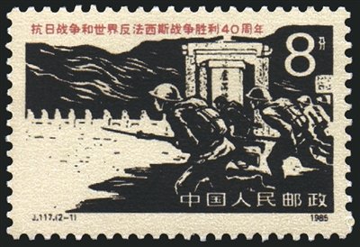 3.新中國(guó)成立后發(fā)行的抗戰(zhàn)紀(jì)念郵票,郵票主圖取材廣泛,圖案名稱多用抗戰(zhàn)史實(shí)名稱來(lái)命名。1952年7月7日發(fā)行的紀(jì)16“抗日戰(zhàn)爭(zhēng)十五周年紀(jì)念”郵票,分別為“盧溝橋風(fēng)云”“平型關(guān)勝利”“歡送新四軍抗日”“領(lǐng)袖策劃反攻”,4枚郵票圖案定格抗戰(zhàn)中4個(gè)有代表性的場(chǎng)景。1965年9月3日發(fā)行的紀(jì)115“紀(jì)念抗日戰(zhàn)爭(zhēng)勝利二十周年”郵票,1套4枚,“毛主席在著作”一圖描繪了毛澤東在延安窯洞里寫作《論持久戰(zhàn)》的情景;“八路軍東渡黃河”郵票圖案為八路軍戰(zhàn)士在黃河邊準(zhǔn)備東渡,奔赴抗日戰(zhàn)爭(zhēng)前線的場(chǎng)面;“人民戰(zhàn)爭(zhēng)勝利”主圖為取得抗日戰(zhàn)爭(zhēng)勝利的八路軍、新四軍和游擊隊(duì)?wèi)?zhàn)士在歡呼勝利的場(chǎng)景;“光榮參軍”主圖為人民群眾積極參加人民軍隊(duì),加入抗戰(zhàn)隊(duì)伍的情景。1985年9月3日發(fā)行的J.117“抗日戰(zhàn)爭(zhēng)和世界反法西斯戰(zhàn)爭(zhēng)勝利40周年”郵票,1套2枚,“盧溝橋中國(guó)軍隊(duì)奮起抗日”描繪了抗日戰(zhàn)爭(zhēng)中國(guó)民黨二十九軍將士沖鋒陷陣、奮勇抗戰(zhàn)的英雄形象;“八路軍和民兵戰(zhàn)斗在長(zhǎng)城內(nèi)外”展現(xiàn)了八路軍配合民兵浴血奮戰(zhàn),共同打擊日寇的光輝形象。1995年9月3日發(fā)行的“抗日戰(zhàn)爭(zhēng)和世界反法西斯戰(zhàn)爭(zhēng)勝利五十周年”郵票,1套8枚,分別為“戰(zhàn)火”“臺(tái)兒莊大捷”“百團(tuán)大戰(zhàn)”“敵后游擊戰(zhàn)”“芒友會(huì)師”“華僑捐獻(xiàn)”“臺(tái)灣光復(fù)”“偉大勝利”。分別描繪了盧溝橋戰(zhàn)斗、臺(tái)兒莊大捷、百團(tuán)大戰(zhàn)、敵后游擊戰(zhàn)、芒友會(huì)師的場(chǎng)景,以及華僑捐獻(xiàn)、歡慶臺(tái)灣光復(fù)、日本正式投降簽字儀式的勝利場(chǎng)面。2005年8月15日發(fā)行的“中國(guó)人民抗日戰(zhàn)爭(zhēng)暨世界反法西斯戰(zhàn)爭(zhēng)勝利六十周年”郵票,1套4枚及1枚小型張,“全民抗戰(zhàn)”展現(xiàn)的是國(guó)共兩黨軍隊(duì)和人民群眾并肩作戰(zhàn)的場(chǎng)面;“中流砥柱”主圖為一名八路軍戰(zhàn)士吹響沖鋒號(hào),展現(xiàn)了八路軍在抗戰(zhàn)中的重要作用;“諾曼底登陸”主圖為登陸后手持步槍的美軍士兵;“攻克柏林”主圖為蘇軍歡呼勝利的場(chǎng)景;小型張主圖為一只沖破鐵絲網(wǎng)的白色和平鴿,寓意和平與正義沖破了戰(zhàn)爭(zhēng)的主題。2015年9月3日發(fā)行的“中國(guó)人民抗日戰(zhàn)爭(zhēng)暨世界反法西斯戰(zhàn)爭(zhēng)勝利七十周年”郵票,1套13枚及1枚小型張,郵票圖案背景表現(xiàn)的是中國(guó)抗戰(zhàn)中的13個(gè)經(jīng)典事件場(chǎng)面,主圖是與該事件相關(guān)的紀(jì)念場(chǎng)館:“九一八”歷史博物館、東北烈士紀(jì)念館、中國(guó)人民抗日戰(zhàn)爭(zhēng)紀(jì)念館、上海淞滬抗戰(zhàn)紀(jì)念館、侵華日軍南京大屠殺遇難同胞紀(jì)念館、臺(tái)兒莊大戰(zhàn)紀(jì)念館、延安革命紀(jì)念館、八路軍總部舊址紀(jì)念館、百團(tuán)大戰(zhàn)紀(jì)念館、平型關(guān)大捷紀(jì)念館、冉莊地道戰(zhàn)紀(jì)念館、新四軍紀(jì)念館、滇西抗戰(zhàn)紀(jì)念館;小型張畫面以《大刀進(jìn)行曲》雕塑為主圖,高度概括、反映了全民抗戰(zhàn)的主題。