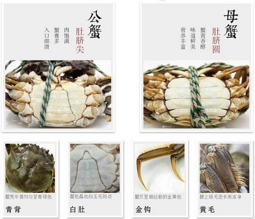 陽澄湖大閘蟹青背、白肚、金爪、黃毛,個體強壯厚實,煮后呈亮橘紅色,口味鮮甜。陽澄湖大閘蟹形成的與眾不同的四大特點:一是青背,陽澄湖蟹殼成青灰色,平滑而有光澤;二是白肚,貼泥的臍腹,晶瑩潔白;三是黃毛,腳毛長黃挺拔;四是金爪,陽澄湖蟹爪金黃堅挺有力,放在玻璃上能八足挺立,雙螯騰空。