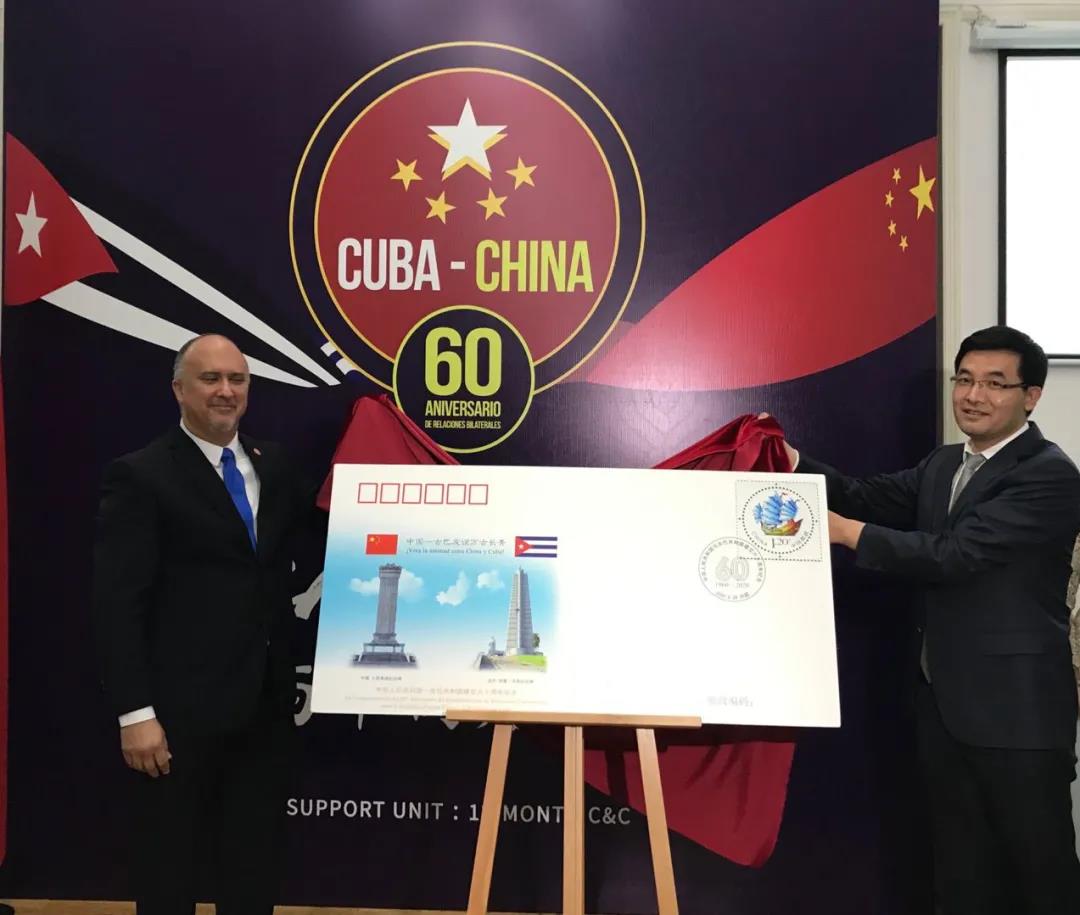 9月28日是中國古巴建交60周年紀念日。古巴駐華大使館舉行慶祝招待會,國務委員兼外長王毅出席。為了紀念這個特殊的日子,中國集郵總公司特發行外交紀念封一枚。招待會上,中國郵政集團有限公司總經理張金良與古巴駐華大使佩雷拉共同為紀念封揭幕,張金良代表中國郵政集團有限公司向古巴大使館贈送紀念封。