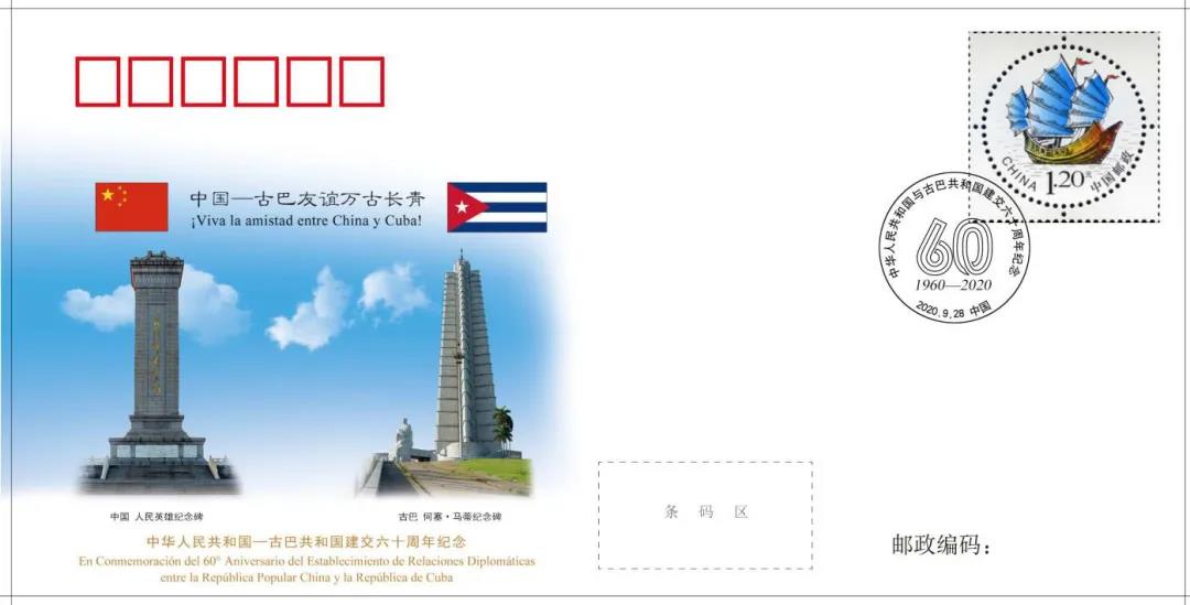 《中國古巴建交60周年紀念封》正面圖案采用中國人民英雄紀念碑和古巴何塞·馬蒂紀念碑,體現中國和古巴兩國不屈不撓爭取民族解放的偉大抗爭精神。紀念封上所貼郵票為《夢想啟航》個性化郵資主圖,郵戳體現兩國建交年份及建交60周年,紀念封的背面為說明性文字及發行信息。何塞·馬蒂是古巴詩人、民族英雄、思想家,他從15歲起就參加反抗西班牙殖民統治的革命活動,42歲便犧牲在獨立戰爭的戰場上,他短暫的一生完全獻給了爭取祖國古巴獨立和拉美自由的事業。
