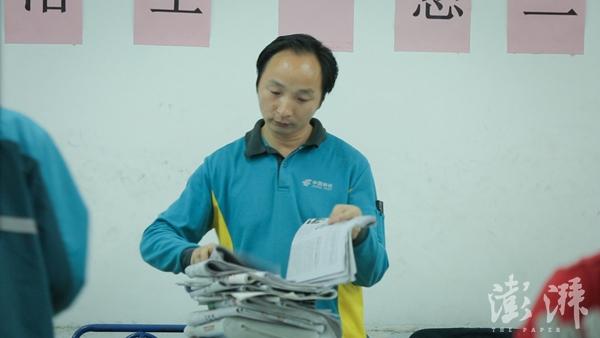 郭振濤:我今年40歲,江蘇高郵人,在上海市臨平路郵局工作已經12年了。日常就是早上五六點鐘到郵局來進行信件分揀,把自己那塊區域的挑出來。挑出來以后,按你的投遞路線把它排好,排好再處理報刊書籍,正常在單位忙完要到10點鐘左右出去。出去投遞三四個小時,到中午忙的時候可能連吃飯的時間都沒有。下午郵件報籍又來一批,然后出去再跑一趟三個小時,差不多能結束工作。一天是也很忙的。