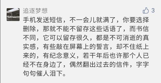 網(wǎng)友追逐夢想說:“手機發(fā)送短信,不一會兒就滿了,你要選擇刪除,那就不能留存這些話語了。而書信不同,它可以留存很久,都是不可消逝的真實感。有些敲在屏幕上的誓言,卻不如紙上來的,有紀念意義。若干年后也許那個人已經不在身邊了,偶然翻出過去的信件,字字句句催人淚下。”
