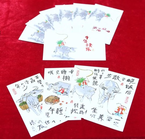 《牛年快樂》普通明信片的郵資圖選取了第二輪生肖牛郵票剪紙原作者齊秀花的作品,由王虎鳴設計,畫面中的牛昂首向上、充滿力量。兩套明信片分別采用水彩繪畫及水墨手繪形式,畫面溫暖充滿童趣,展現出濃厚的春節民俗特色,分別由景紹宗及段雅婕、潘振磊設計。《辛丑吉祥》極限明信片由韓美林先生設計指導,明信片正面左下角圖案及背面圖案與郵資圖相同,形成極限概念,四枚明信片廣告面可組成完整的“恭賀新春”吉祥短語。祝福卡《牛年如意》《新春送福》,畫面以健碩而充滿活力的牛為主要形象,傳遞國裕民康的良好祝愿,分別由張旺、武世寧設計。2021年賀年專用郵票分別為《國裕家康》《新春送福》,兩套郵票構成的小全張,以紅色、金色為主體色調,將“福”字、甲骨文的“門”字及中國書畫中的斗方元素進行組合設計,寓意歲月更新福滿門、開門見福迎新春。《國裕家康》由韓美林設計,《新春送福》由陳楠設計。相關產品自11月5日起在全國郵政網點銷售,廣大用戶可在郵政網點和中國郵政微商城明信片專區選購。