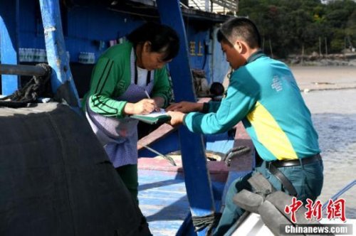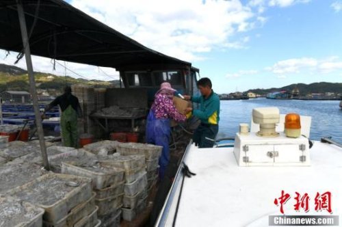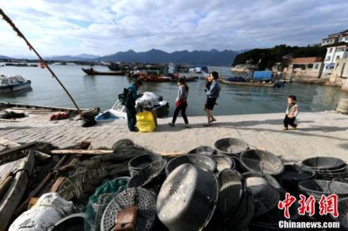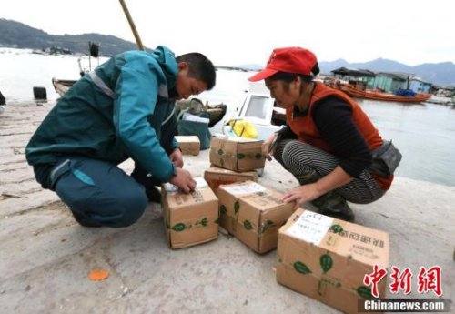 “雙十一”剛過,福建省寧德市蕉城區海上郵遞員石進全比往常更加忙碌。圖為村民到碼頭領取包裹。