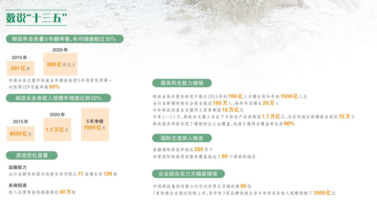 5年來(lái),郵政業(yè)發(fā)展突飛猛進(jìn)。快遞年業(yè)務(wù)量從2015年的207億件增長(zhǎng)到今年的800億件以上,5年翻了兩番。我國(guó)包裹快遞量超過(guò)了美國(guó)、日本、歐洲等發(fā)達(dá)經(jīng)濟(jì)體總和,對(duì)世界CEP(快遞包裹)市場(chǎng)貢獻(xiàn)率超過(guò)了50%。2019年,中國(guó)郵政行業(yè)業(yè)務(wù)收入累計(jì)完成9642.5億元,與此同時(shí),城市末端智能快件箱的市場(chǎng)需求快速增長(zhǎng),農(nóng)村郵政服務(wù)網(wǎng)絡(luò)及扶貧成果引人矚目……回望“十三五”,郵政業(yè)拔節(jié)孕穗、碩果累累。坐上駛向人民美好生活的郵車(chē),一幅幅美妙的圖景不斷閃現(xiàn)。