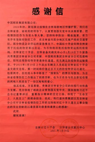 面對疫情,吉林郵政高度重視,堅決按照黨中央決策部署和集團公司工作安排,全面動員,全面統籌,全面協調工作,把人民群眾生命安全和身體健康放在第一位,加大防控力度,切實抓緊抓細抓實各項工作。特別是在吉林省內部分地區實施嚴格的交通管控、部分物流企業停運的緊急情況下,吉林郵政主動作為,積極與吉林省紅十字會溝通,緊急開通抗疫物資運輸綠色通道,義務運送抗疫物資。