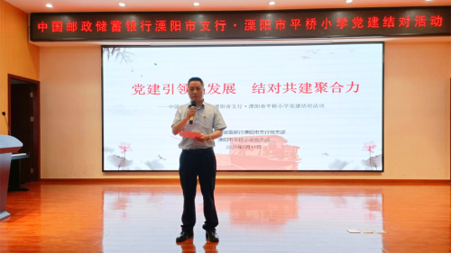 為進一步加強黨支部建設,引導和激勵廣大黨員干部“不忘初心、牢記使命”,郵儲銀行溧陽市支行黨支部、溧陽市平橋小學黨支部于5月11日上午在平橋小學報告廳開展了結對共建活動。這是該行自2016年與平橋小學簽訂結對共建協(xié)議以來,連續(xù)第6年組織黨員代表、“紅鈴鐺”課堂志愿者走進學校開展共建活動。