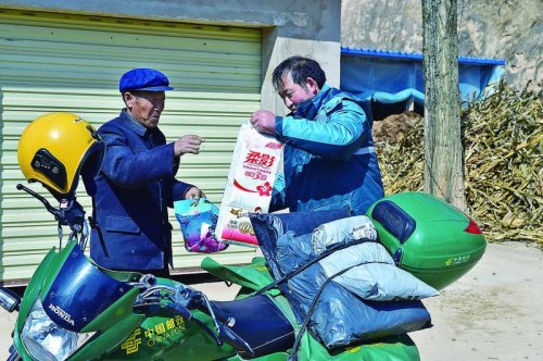 在趙滿明的摩托車上,經常會出現與工作“不相符”的物品,有時是衛生紙等生活用品,有時是瓜果蔬菜,這都是他幫投遞區域內生活不便的群眾代買的物品。“我每天都來往在鎮上,幫他們代買一些生活用品,都是舉手之勞?!壁w滿明輕描淡寫地說。