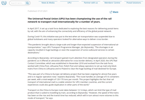 郵聯(lián)運(yùn)輸項(xiàng)目組經(jīng)理揚(yáng)·博伊南斯基表示:“這一郵路每周可帶運(yùn)5-6個(gè)鐵路集裝箱,總重量約為120-170噸/月。這一項(xiàng)目進(jìn)一步證實(shí)了鐵路運(yùn)郵可為各成員國提供可行的運(yùn)輸方案這一事實(shí),當(dāng)前的運(yùn)郵經(jīng)驗(yàn)也可為其在全球其它范圍內(nèi)的推廣提供指導(dǎo)意見。同時(shí),鐵路運(yùn)輸?shù)乃俣日诓粩嗵嵘?,?jīng)轉(zhuǎn)時(shí)限也不斷縮短,這也將為鐵路運(yùn)郵吸引更多的業(yè)務(wù)量。”