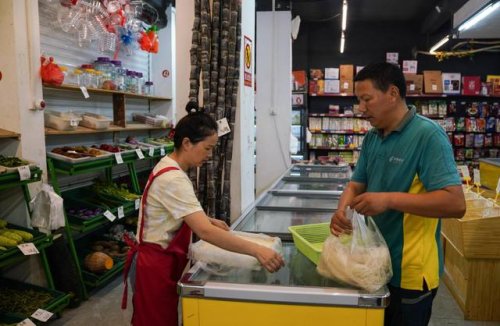 9月28日,雙峰郵政所的郵遞員吳文清(右)在雙峰鎮一家超市選購村民需要的物品。