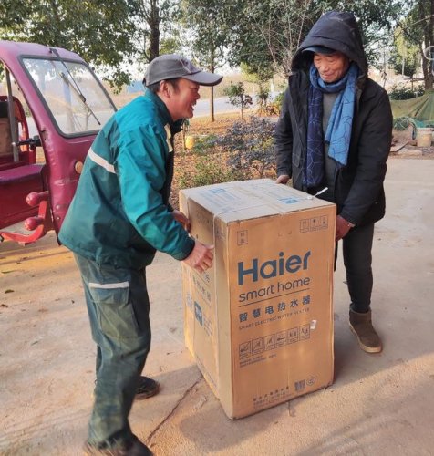 熊桂林為燎原村陳屋基灣村民陳志強(qiáng)老人送去網(wǎng)購的熱水器。