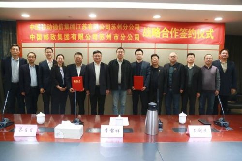 日前,蘇州移動與中國郵政集團有限公司蘇州分公司簽訂戰略合作協議,蘇州移動總經理李寶祥,副總經理王利民、齊貝貝,中國郵政集團有限公司蘇州分公司總經理陳力烈等領導出席了簽約儀式。