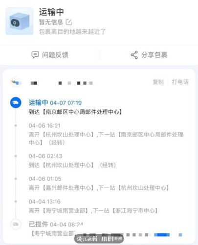 周爸爸查詢了信息,今天上午7點,郵件已經到達南京郵區中心局郵件處理中心,預計今天就能送達目的地。