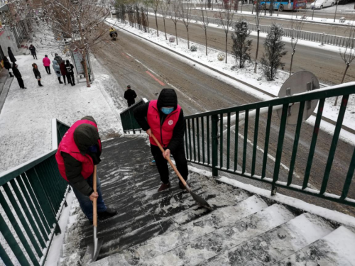 清雪過(guò)程中,志愿者們不懼嚴(yán)寒、揮動(dòng)掃把、拿起鐵鍬,在街路、天橋、小區(qū)、廣場(chǎng)等地除雪除冰。雖然室外天寒地凍,但他們熱情高漲、干勁不減,用實(shí)際行動(dòng)踐行著為民服務(wù)的熾熱情懷。同時(shí),廣大志愿服務(wù)團(tuán)隊(duì)還廣泛宣傳、動(dòng)員市民積極行動(dòng)起來(lái),將自家周邊的積雪清理干凈,并勸導(dǎo)老人、兒童暴雪天氣非必要減少外出,讓市民群眾切實(shí)感受到志愿服務(wù)的溫暖。