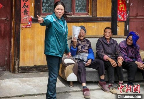 圖為朱正琴與村里的老百姓們交談?!∧ス鹳e 攝