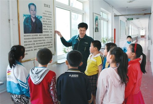 王明杰向葦沙河鎮小學的同學講述郵政“鐵人”宮本玉的事跡?!跬跫抑?攝
