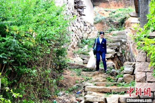 15日15時,中新網記者跟隨蔣玉美走村入戶,投遞郵件、報刊和各類包裹。一路上,或是陡坡,或是山間小路,崎嶇不已。