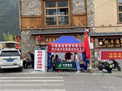 9月6日,四川瀘定地震后第二天,郵政流動服務車駛入震中磨西鎮。同時,瀘定縣郵政分公司搭建臨時郵局,第一時間恢復和保障郵政服務,開通銀行卡掛失、保險理賠咨詢等業務辦理的“綠色通道”,贈閱黨報黨刊,參與救災安撫,切實滿足百姓需求,傳遞黨的聲音,送去黨的關懷。