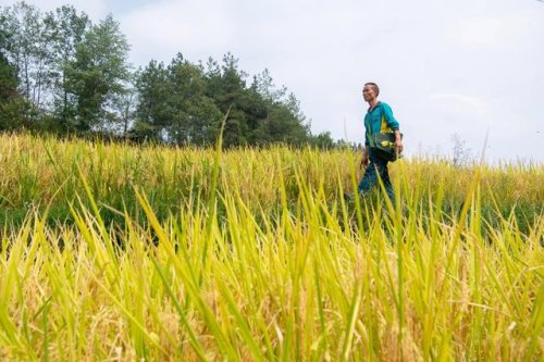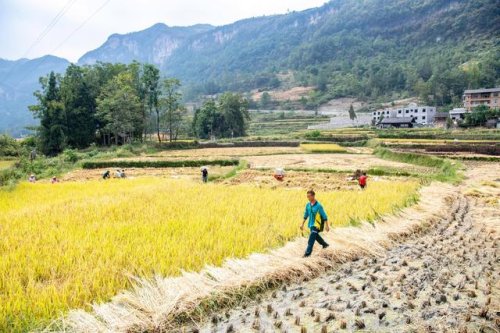 9月15日,投遞員張永洪行走在武陵山間的稻田田坎上。