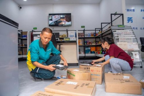 9月15日,在何家巖村村郵站,投遞員張永洪整理待寄的大山土特產。