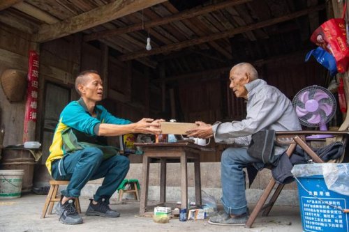 9月15日,投遞員張永洪(左)將快遞送到行動不便的老人手中。