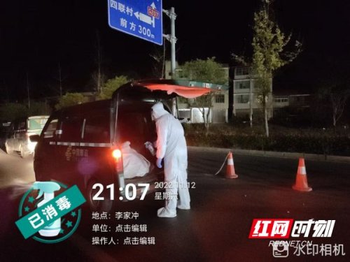 21點10分,郵車到達邵陽縣交接防疫卡口,邵陽縣郵政分公司陳偉、劉澤湘兩位同志穿上密封的防護服早已等候多時,他們將郵袋做了全面消殺處理,交接完成后駕駛郵車向目的地駛?cè)ァ?1點50分,郵件到達邵陽縣李家沖,兩人與其家人完成面交。