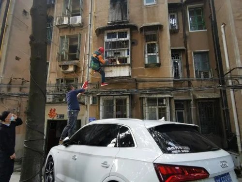 危急之下,虢術高撿了塊石頭,順著樓房的外墻,借用防盜窗和燃氣管道,麻利地爬上2樓窗口,用石頭敲碎了玻璃,社區副書記蔡超給虢術高遞上一個滅火器,虢術高接過后將噴射口通過窗口對準著火點,不到一分鐘明火就被熄滅。