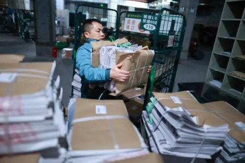 在貴州省龍里縣草原路郵政郵件處理中心外,莫富元將當天需要投遞的物品拿上小貨車(2月14日攝)。