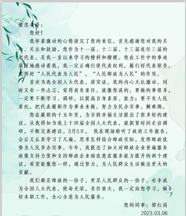 “人民代表人民選,我當(dāng)代表為人民;人民郵政為人民,干好本職為人民。”何健忠希望這兩封信能如同接力棒,將郵政人的為民情懷、人民代表的職責(zé)使命傳遞下去。