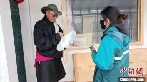 圖為麥桃吉將快遞送到民眾手中。(資料圖,中國郵政集團有限公司甘肅省瑪曲縣分公司供圖)
