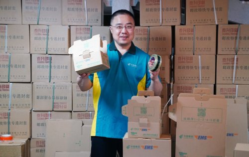 刁海濤帶著記者來到中國郵政集團有限公司北京市分公司一處擺滿貨架和快遞箱的生產現場?!?、2、3、4、5……”不到一分鐘的工夫,一個無需膠帶、僅靠拼插即可成型的快遞紙箱就在刁海濤手中組裝完畢。“咚!”他向剛剛拼插好的快遞紙箱重重擊打了一拳,紙箱表面只有輕微的凹陷,并沒有發生任何損壞。刁海濤解釋說,這款專利包裝箱借鑒了中國傳統的榫卯技術,單純依靠折疊、插接就能快速組裝完成,完全不需要使用膠帶進行封裝。別看比普通紙箱的重量輕,但這款專利產品的邊壓強度、耐戳穿力、抗跌落能力等指標,都遠比普通紙箱要強得多。