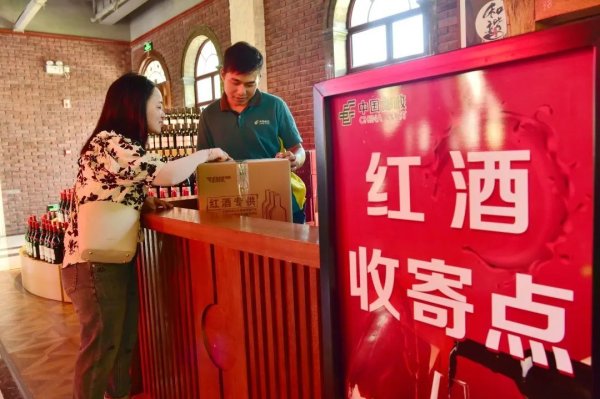 在昊苑村格莉琪酒莊的紅酒收寄點,西夏區(qū)郵政分公司火車站攬投部的葉萬文駐點為參觀酒莊的游客提供紅酒打包寄遞服務(wù)。