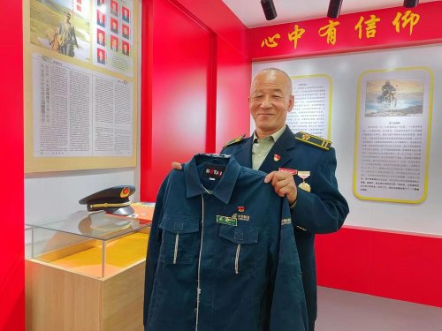 10月25日,木壘縣博斯坦鄉,馬進福向記者展示自己的第一套郵政制服。