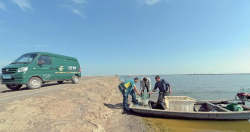 王海進在漁船碼頭送特快專遞。