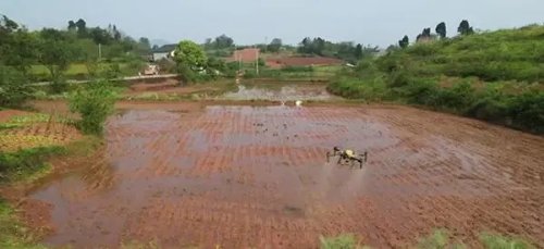 植保無人機撒下秧田除草劑。郵儲銀行重慶分行供圖