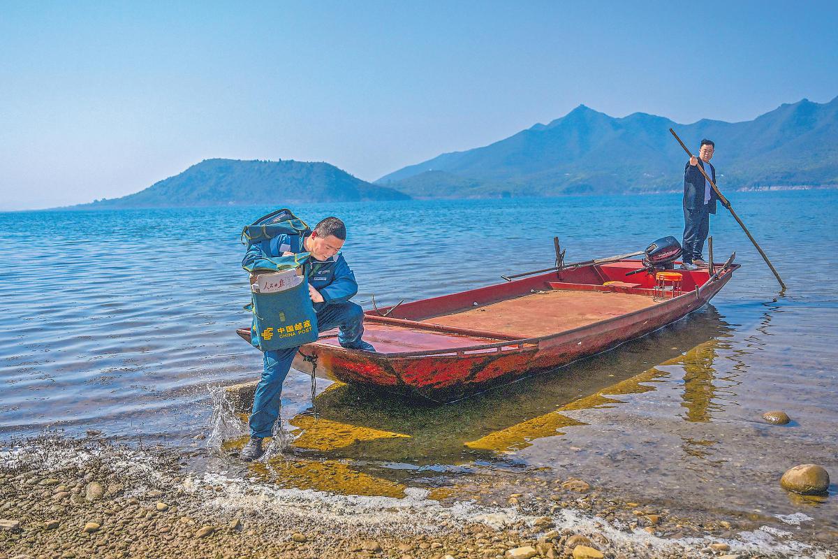 綠色摩托車、綠色郵包、絳紅色渡船、碧波蕩漾的水面和遠處如黛的群山,石新國穿行其間,如同置身一幅青山綠水的秀美畫卷。“這條郵路我已經走了20多年,只要鄉親們需要,我會一直走下去。”石新國堅定地說。