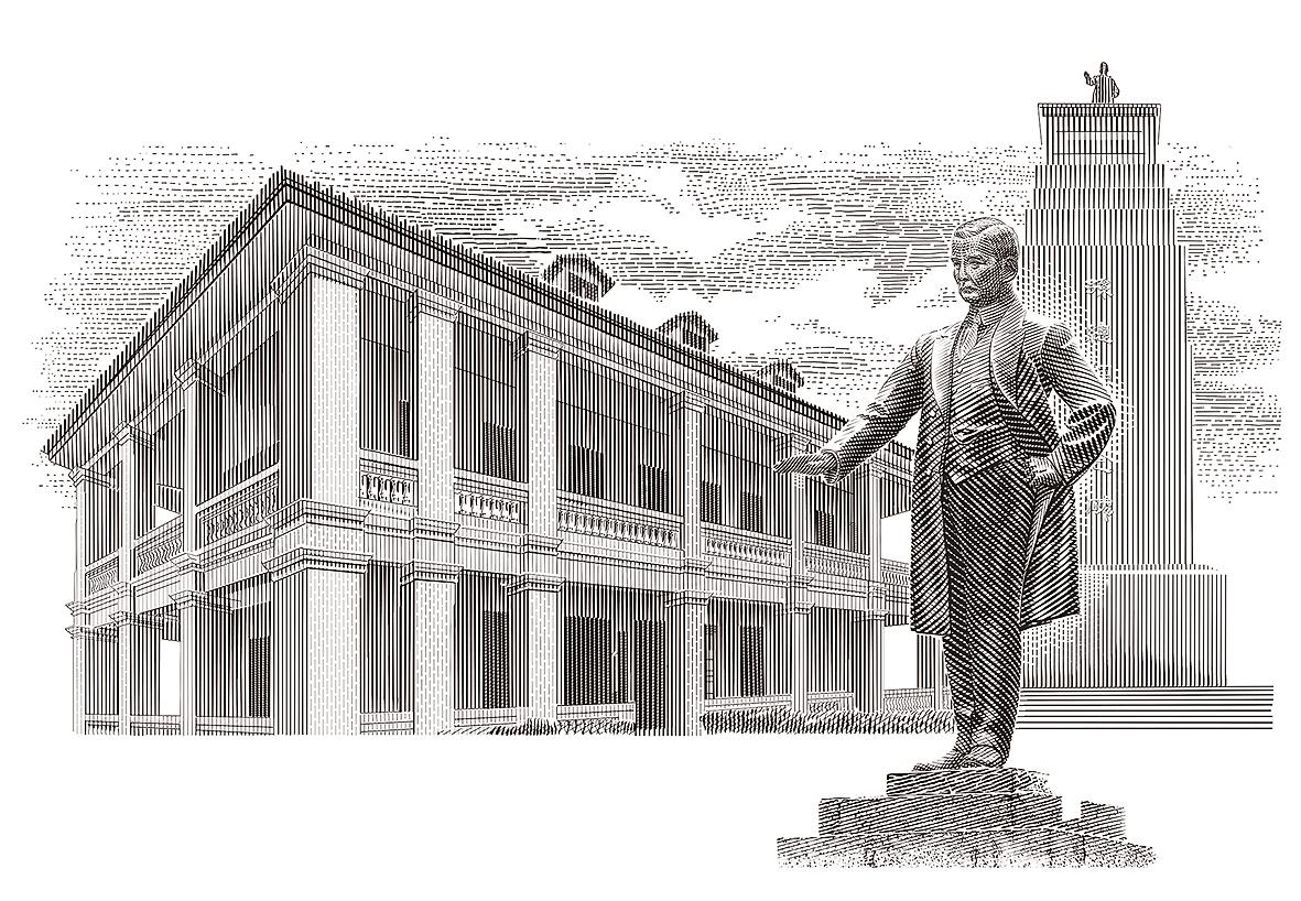 郵票二圖由徐喆和劉明慧兩位雕刻師共同創(chuàng)作。徐喆負(fù)責(zé)建筑部分,劉明慧負(fù)責(zé)雕像部分,于是同一枚郵票呈現(xiàn)出了兩種雕刻風(fēng)格,建筑的粗獷和人物的細(xì)膩,二者和諧統(tǒng)一、相得益彰。劉明慧對(duì)人物的刻畫非常準(zhǔn)確,能夠表現(xiàn)出原作的各種細(xì)微之處,特別是對(duì)人物面部表情的精準(zhǔn)把握,呈現(xiàn)出雕像特有的質(zhì)感和光影效果。選用紅色雕刻油墨印制,表達(dá)愛國精神,橘色的熒光使畫面更加溫暖、莊重。淡淡的米黃底色為郵票營造出一種復(fù)古的氛圍,既體現(xiàn)了年代感又與主題相得益彰,展現(xiàn)出黃埔軍校百年歷史的滄桑與厚重。