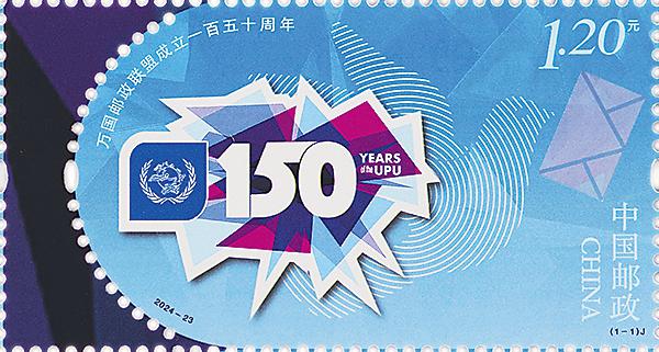 該套郵票一套1枚,以萬國郵政聯盟150周年標識為畫面主體,背景融入線條組成的信鴿圖案,寓意郵政網絡通達全球,表達了“聯系世界、賦能于人”的內涵。畫面左側LOGO白色邊緣線條以及“150”文字采用無色熒光工藝,熒光燈下具有較強的視覺沖擊力;右側信封采用燙印工藝,通過覆膜呈現變色效果。該套郵票由蔣蔚設計,責任編輯為溫文雅,北京郵票廠有限公司膠印(采用局部燙印)工藝印制。